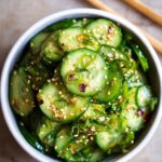 This Asian Cucumber Salad is a refreshing and crisp side dish featuring thinly sliced cucumbers tossed in a flavorful dressing of rice vinegar, soy sauce, toasted sesame oil, ginger, garlic, and a touch of sweetness. The combination of chili garlic sauce adds a spicy kick, making it a perfect vegan and gluten-free accompaniment to a variety of meals.