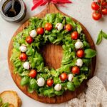 A festive and simple Caprese Salad Wreath featuring baby arugula, grape tomatoes, fresh mozzarella, and basil, dressed with balsamic vinaigrette. Perfect for holiday parties, this colorful and fresh salad is quick to prepare and visually stunning.