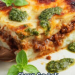 Grease your baking dish, press the rice mixture evenly on the base, then spoon over the bolognese sauce, spreading it to the edges. Pour over the bechamel sauce, smooth the top, and sprinkle the remaining cheese. Bake at 180°C (360°F fan) for 30 minutes until golden and bubbling. Let it cool a bit before adding fresh basil and pesto for that vibrant finish.
