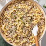 A hearty and creamy hamburger stroganoff made with ground beef, egg noodles, and a rich sour cream sauce, perfect for a comforting weeknight dinner.