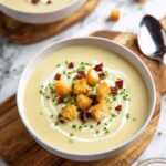- Serve with Toppings: Ladle the soup into bowls, add a drizzle of cream, and top with crispy pancetta or bacon, croutons, and freshly diced chives. Enjoy immediately.