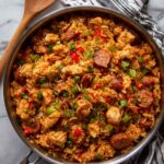 One Pan Jambalaya is a flavorful, comforting dish combining browned chicken, andouille sausage, vegetables, and rice in a single skillet. This classic Cajun-inspired meal is seasoned with basil, Cajun spices, and cayenne pepper for a perfect balance of heat and aroma, making it a satisfying main course ideal for family dinners.