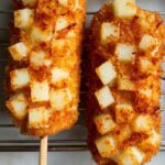 Delight in the crispy, cheesy goodness of Korean Corn Dogs, known as 감자핫도그 (Gamja Hotdog). These snacks feature beef franks wrapped with melted cheese, coated in a yeasted batter mixed with shredded russet potatoes and seasoned with salt, then rolled in panko bread crumbs and deep-fried to golden perfection. Served with ketchup, mustard, and a sprinkle of sugar, these corn dogs offer a perfect balance of savory, sweet, and crunchy in every bite.