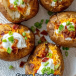 Enjoy perfectly crispy and tender Air Fryer Baked Potatoes topped with melted cheddar cheese, crispy turkey bacon, fresh green onions, and a dollop of sour cream. This fully loaded baked potato recipe is quick, easy, and a delicious side or main dish.