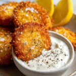 Crispy fried zucchini crisps paired with a flavorful garlic aioli dipping sauce, perfect as a crunchy appetizer or snack that stays crisp even when cooled.