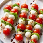 Caprese Skewers are a fresh and elegant appetizer featuring cherry tomatoes, fresh basil, and miniature mozzarella balls threaded on wooden skewers, drizzled with extra-virgin olive oil and balsamic glaze, then seasoned with kosher salt and black pepper. Perfect for parties or a light snack.