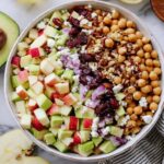 A vibrant and healthy Fall Chickpea Salad combining the sweetness of apple and dried cranberries with creamy avocado, crunchy nuts, and tangy feta cheese, all tossed in a zesty apple cider dressing. This salad is perfect for an easy fall lunch or dinner, offering a refreshing blend of textures and flavors.
