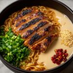 Fiery chicken ramen with creamy garlic sauce combines tender chicken pieces marinated in soy sauce and paprika, simmered in a rich, velvety broth made with chicken broth, heavy cream, and chili sauce. Tossed with instant ramen noodles and garnished with sliced green onions and sesame seeds, this dish delivers a satisfying spicy kick in every savory slurp.