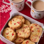 These Fruitcake Cookies are buttery shortbread cookies loaded with festive candied fruit and nuts, flavored with dry sherry and lemon for a holiday-inspired treat. Perfect for gifting and holiday parties, they combine the classic flavors of fruitcake in a delightful cookie form.