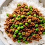 A flavorful and quick Japanese-inspired gingery ground beef dish, perfect for serving over rice. This soboro donburi features savory ground beef cooked with soy sauce, fresh ginger, brown sugar, and peas for a delicious and comforting meal.