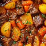 This Easy Homemade Beef Stew features tender beef chuck roast chunks, hearty potatoes, and carrots simmered in a rich, flavorful broth with tomato paste and fresh herbs, offering a comforting and satisfying meal perfect for cozy dinners.