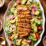 - Assemble the salad: On a large platter, place the chopped romaine lettuce. Add cucumbers, cherry tomatoes, crumbled bacon, diced avocado, corn, and sliced red onion evenly across the bed of lettuce. Slice the cooked chicken cutlets and arrange on top, preserving their breast shape for presentation.