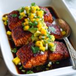 - Serve: Place salmon on plates, spoon reduced teriyaki sauce over top, and add generous spoonfuls of mango salsa. Optionally serve with steamed white rice.