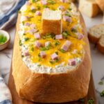 This Mississippi Sin Dip is a creamy, cheesy, and savory appetizer perfect for parties and gatherings. It features a blend of cheddar cheese, sour cream, cream cheese, Rotel tomatoes with green chiles, and chopped ham all baked inside a hollowed-out French bread loaf. Topped with extra cheese, ham, and green onions, this dip offers bold flavors and a satisfying texture that pairs wonderfully with the toasted bread pieces cut from the loaf.