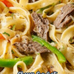 Philly Cheesesteak Pasta combines tender strips of steak, sautéed onions and green bell peppers, and a creamy mozzarella sauce tossed with pappardelle pasta, creating a rich and satisfying meal inspired by the classic Philly cheesesteak sandwich.