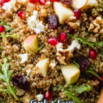 - Assemble Salad: In a large bowl, combine the cooled quinoa, 1 cup pomegranate seeds, 2 cups chopped arugula, 1 chopped Gala apple, ½ cup chopped walnuts, ¾ cup crumbled feta, and ½ cup dried cranberries.