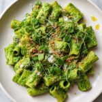 This 15 Minute Super Green Rigatoni is a quick and comforting weeknight meal packed with nutritious spinach blended into a smooth sauce, enhanced with savory anchovies or miso, garlic, and parmesan. Crispy chili oil-infused breadcrumbs add a delightful crunch, while the chili oil drizzle provides a spicy, aromatic finish. Perfect for using up wilting greens and ready in just a quarter of an hour, this dish balances creamy sauce and al dente pasta for a family-friendly vegetarian dinner.