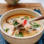 Tom Kha Gai is a fragrant and creamy Thai coconut chicken soup that balances sour, spicy, sweet, savory, and salty flavors. Ready in just 30 minutes, this comforting soup features tender chicken thighs, mushrooms, lemongrass, galangal, and aromatic makrut lime leaves simmered in a rich coconut milk broth, making it perfect for a quick yet authentic Thai meal.