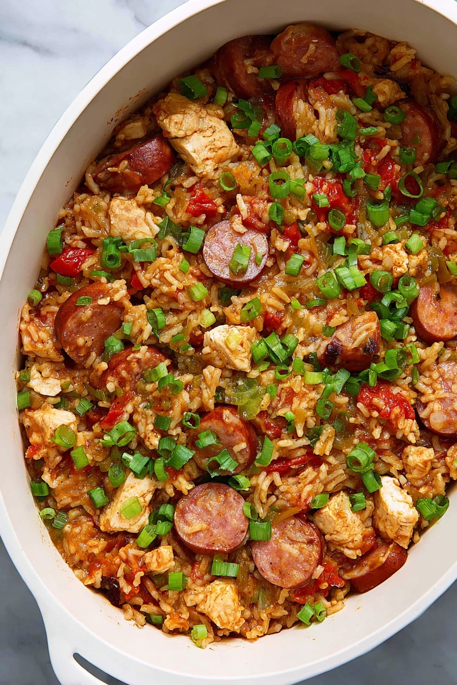 Once the rice is tender, remove the lid and test it—if it’s perfect, use a gentle hand to fluff the jambalaya. Avoid stirring vigorously here to prevent the rice from turning gummy. Finally, sprinkle sliced green onions over the top for a fresh finish. Serve it warm and enjoy the rich, smoky, comforting goodness of this easy slow cooker jambalaya.