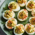 - Garnish and serve: Sprinkle a light dusting of paprika over the filled deviled eggs. Serve immediately and enjoy!