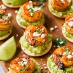Spicy Shrimp Guacamole Bites are a flavorful and easy-to-make appetizer perfect for parties. Juicy roasted shrimp seasoned with chili powder, cumin, and smoked paprika are paired with fresh guacamole, lime juice, and cilantro, all served on bite-sized round corn tortilla chips and garnished with crumbled feta or queso fresco for a zesty, satisfying snack.