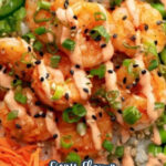 Lay down a fluffy base of your rice (or a rice and lettuce combo if you like), then layer your cooling cucumbers, spicy jalapeños, shredded carrots, steamed edamame, and finally your saucy shrimp. Top generously with spicy mayo, toasted sesame seeds, sliced green onions, and a final drizzle of sriracha if you’re feeling bold. Then dive right in!