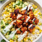 This Street Corn Chicken Rice Bowl features tender, spiced chicken thighs paired with smoky grilled corn, zesty lime crema, and crumbly Cotija cheese, served over fluffy cooked rice. It's a vibrant and satisfying meal that's easy to prepare and perfect for a flavorful weeknight dinner or casual gathering.
