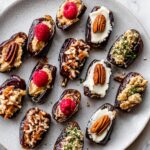 - Almond Butter Raspberry: Stuff each date with 1 ½ teaspoons of creamy almond butter and press a fresh raspberry into the center of each.