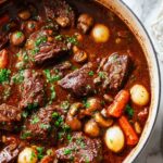 Beef Bourguignon is a classic French stew featuring tender chunks of beef simmered in a rich red wine and beef stock sauce with bacon, mushrooms, pearl onions, and aromatic vegetables. This slow-cooked dish is perfect for a hearty family dinner with deep flavors developed over several hours of cooking.