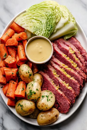 - Slice and Serve: Slice the corned beef against the grain into thin slices. Serve alongside the cooked potatoes, carrots, and cabbage. Offer whole grain or Dijon mustard as an optional accompaniment.
