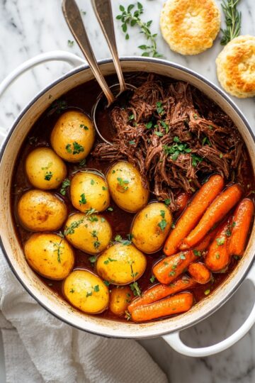 - Hearty and comforting: Baby potatoes and carrots soak up the luscious juices, pairing perfectly with the beef.