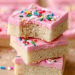 These Vegan Sugar Cookie Bars feature a sweet and buttery base topped with a creamy pink vegan buttercream frosting, perfect for any holiday or occasion. They are easy to prepare, customizable with food coloring and sprinkles, and delightfully soft with a tender crumb.