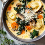 A comforting and flavorful one pot vegetable tortellini soup packed with hearty vegetables, creamy cheese tortellini, and fresh kale, perfect for a nourishing meal any day.