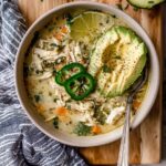 This hearty White Chicken Chili recipe is a comforting and flavorful slow-cooked dish featuring tender chicken, aromatic spices, and creamy coconut milk. Perfect for busy weeknights or freezer meal prepping, it is naturally dairy-free and can be customized with optional beans and fresh toppings like cilantro and lime wedges.