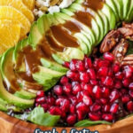 A refreshing and festive winter salad featuring mixed baby greens, citrus segments, avocado, pomegranate seeds, crumbled feta, and candied spiced nuts, all tossed in a sweet and tangy cranberry balsamic dressing. Perfect for holiday gatherings or a vibrant, healthy meal.